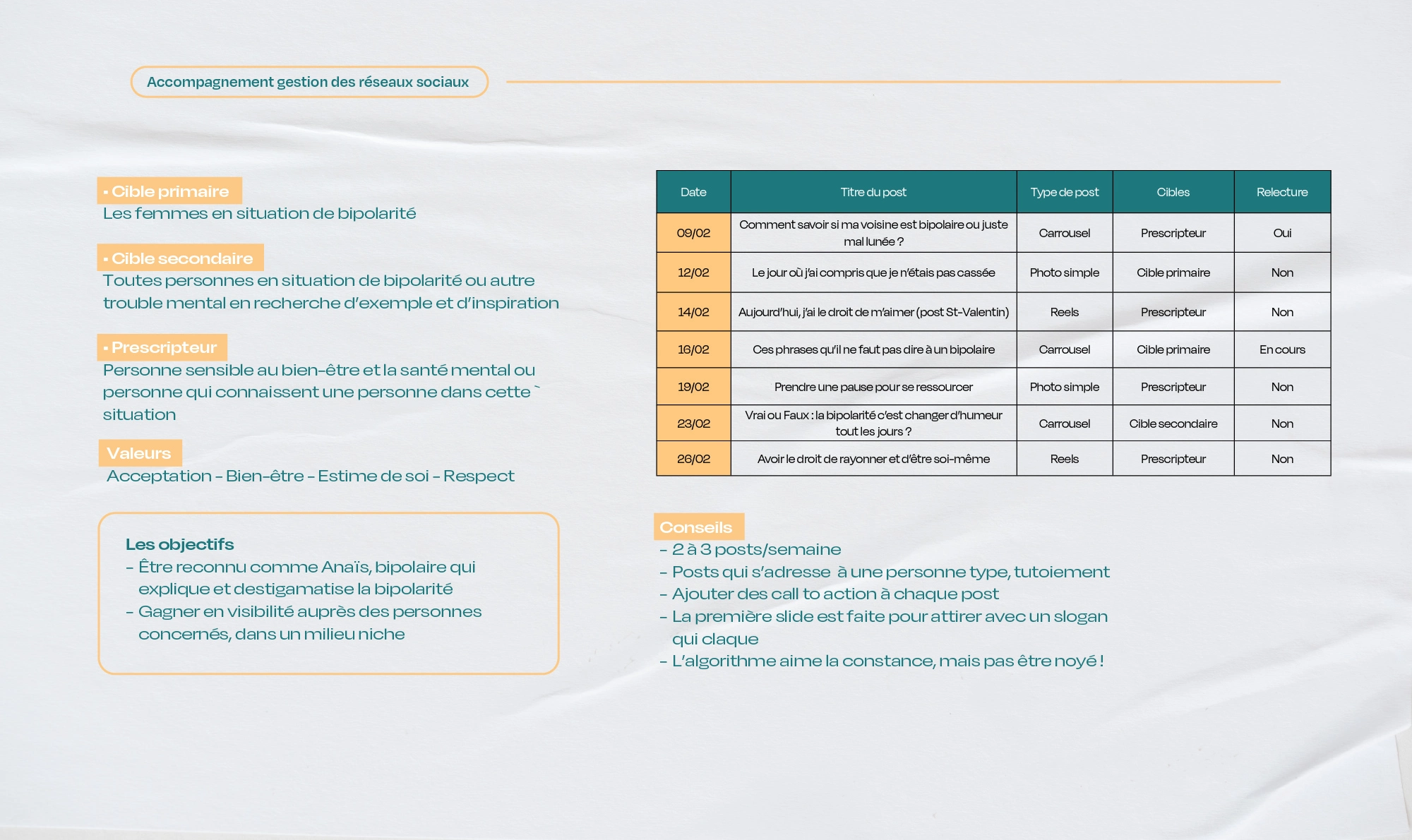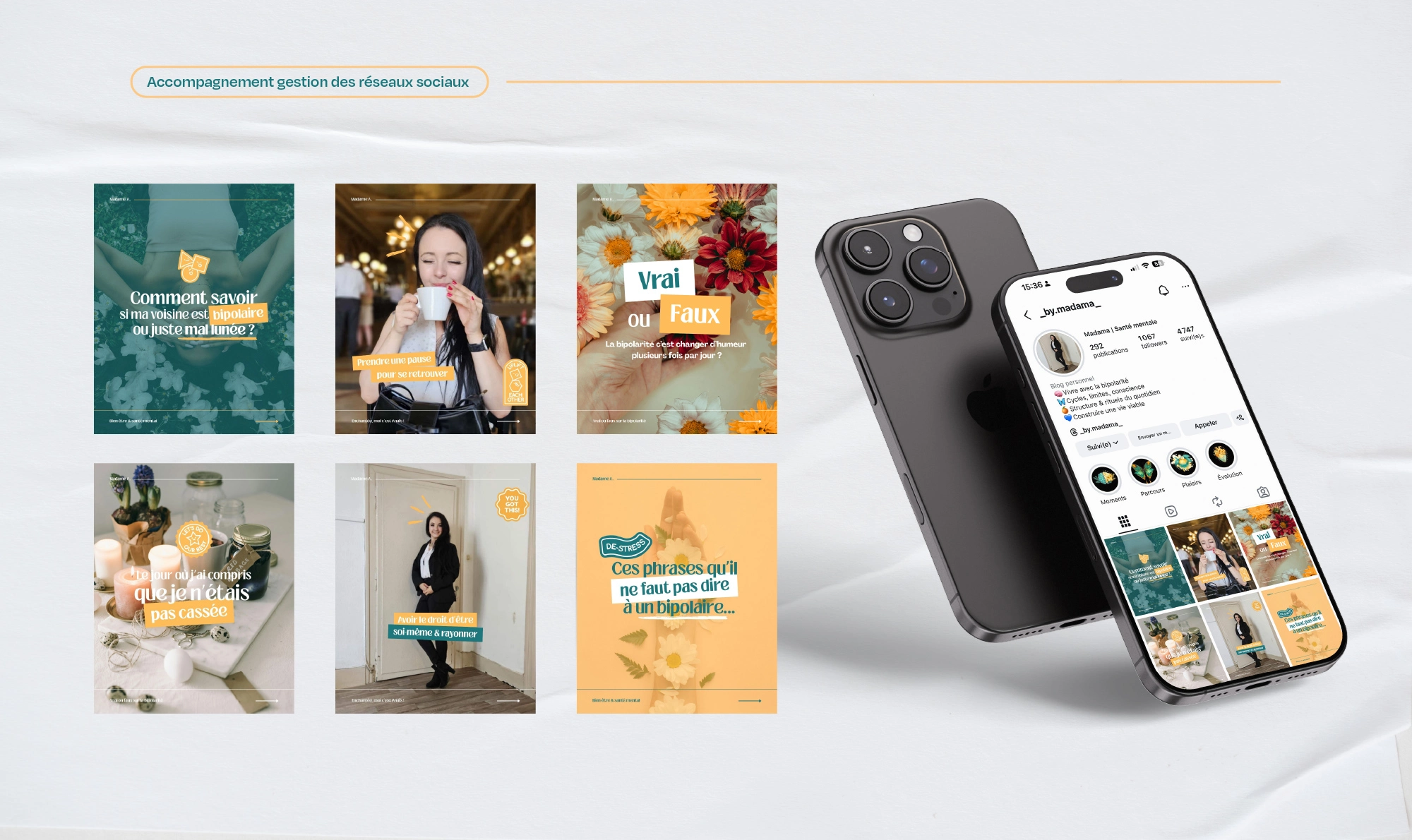 Anaïs, m’a contacté pour l’accompagner dans son projet qui tourne autour du bien-être et de la sensibilisation à la bipolarité. Étant elle-même Bipolaire, elle aborde différentes facettes de cette maladie sur son compte Instagram et souhaites développer différents projets autour de la santé mentale.